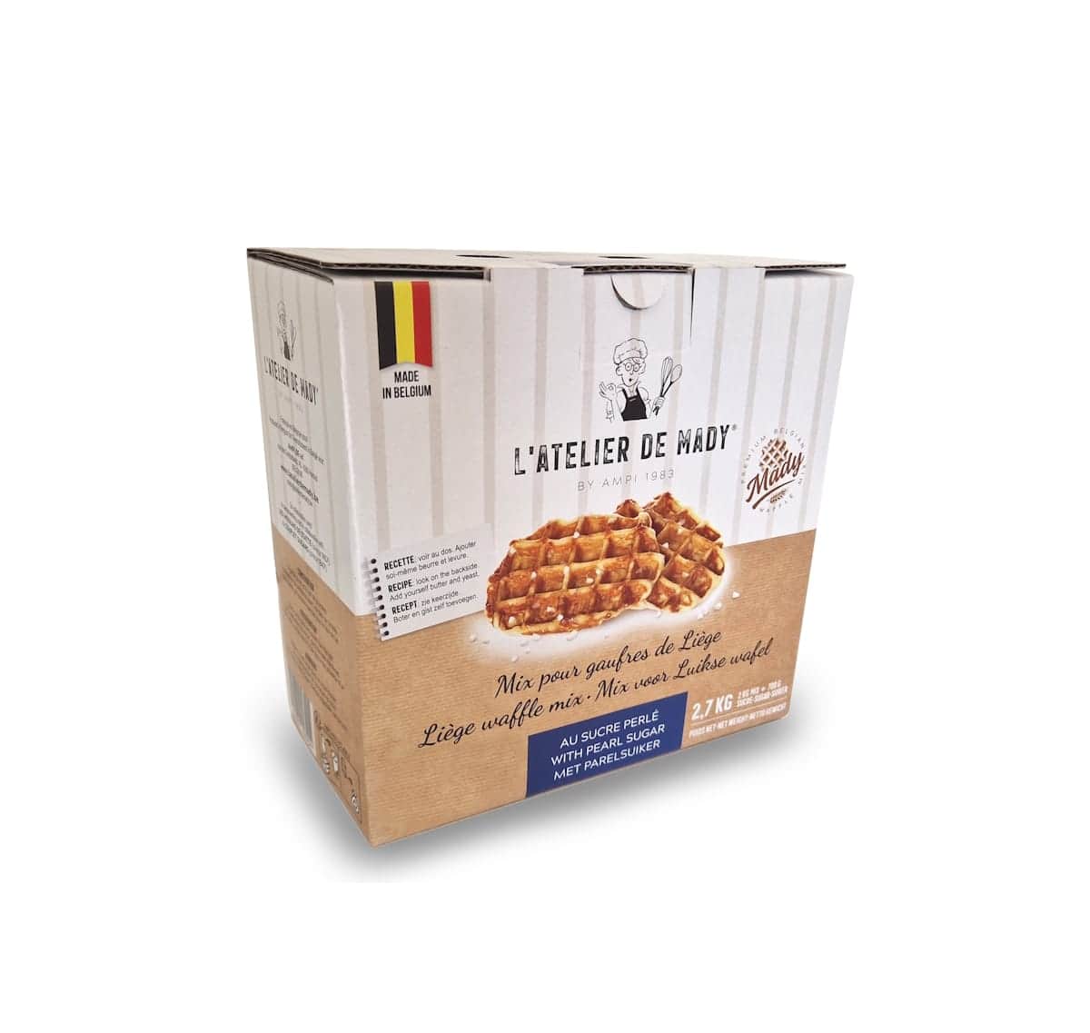 L’Atelier de Mady es una caja de ingredientes que permite preparar +/- 44 (100 gr.) o +/- 54 (80 gr.) gofres de Lieja con azúcar perlado.
